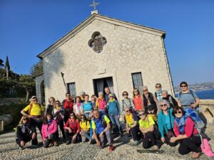 Le previsioni del tempo un po’ ballerine ci hanno indotto ad anticipare questa bella uscita a venerdì 20 marzo e così 29 tra consorelle, confratelli ed amici col bus alle 9,10 eravamo a Bordighera Alta, pronti per l’inizio della camminata con un bel sole. Raggiungiamo la parrocchiale di Santa Maddalena: una chicca; il parroco ci viene incontro per illustrarci le bellezze di questa chiesa molto antica e da poco totalmente ristrutturata che ha portato alla luce i colori e gli affreschi di un tempo, un vero gioiellino. Ora su per raggiungere il sentiero del Beodo su cui camminiamo e sotto di noi un tempo scorreva l’acqua dell’omonimo acquedotto, che dissetava Bordighera. Siamo in mezzo ad un tripudio di ulivi secolari e di palme dattilifere (c’è anche un vivaio), oltre a fiori e distese di alberi di mimose e cespugli di ginestra bianca ormai sfioriti. Il sentiero con leggerissimo dislivello ondeggia nella vallata dove scorre il torrente Sasso. Arrivati sotto i maestosi piloni dell’autostrada il Beodo termina e ci inoltriamo in un suggestivo sentierino che si immette tra palme, canne ed alberi maestosi seguendo da vicino il Sasso; le sue acque limpidissime, le cascatelle e la fitta ombra ci portano in un paesaggio surreale. Guadiamo due volte il Sasso ed il sentiero lambisce le acque cristalline, sfiorando i resti di mulini e di altre costruzioni segno che un tempo tutta questa zona era terrazzata, abitata e coltivata. Ora il tratto è molto selvaggio, ma affascinante. Ben presto termina sotto un ponte che ci riporta sulla strada asfaltata ed iniziamo la breve salita che ci conduce di fronte alla chiesa di Sasso. Proseguiamo in salita per una creusa un po’ mattonata e un po’ sterrata, che ci conduce sulla dorsale della collina, fino alla chiesetta della Madonna della Neve.